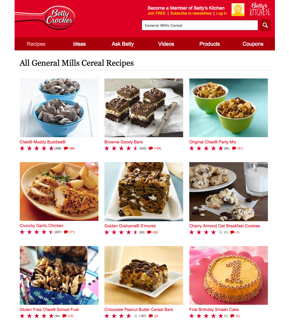 The Betty Crocker website gives you themed recipes for full course meals and desserts. It contains some classic treats, tips and awesome date ideas. We hope that you enjoy cooking with your favorite cereals as much as we have.
